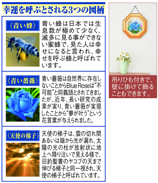 めったに見られない青い蜂、自然界に存在しないと言われた青い薔薇、後方に差し込む天使の梯子と言われる太陽の光、そんな3つの奇跡を一つにした開運アートのご紹介です。青い蜂は、滅多に目にすることができないことから幸せを呼ぶ蜂いわれています。また、青い薔薇は自然界に存在しませんでしたが、近年、青い薔薇の開花が実現したことから "奇跡の薔薇" と呼ばれています。そして、天使の梯子は旧約聖書のヤコブの天まで伸びる梯子と似ている事から、天使の梯子と呼ばれるようになったのです。そんな3つの開運パワーを秘めたアート作品を、繁栄と貯蓄を意味する六角形のマットと、運気を家の隅々まで行き渡らせるとされる八角形の額に収めました。どうぞご自宅のリビングや寝室にお飾りください。今までにない金運と愛情の上昇をひしひしと感じ、奇跡のような大いなる幸運が、あなたを包み込むことでしょう。