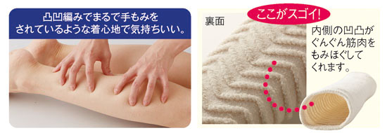 ふくらはぎにつけるだけで手もみマッサージを受けているような刺激を感じる気持ちいいサポーターです。その秘密は内側の凹凸状の編み方で、つけるとぐっと押されているのを感じ、まるでマッサージを受けているかのようです。お休みになる前や、くつろいでいる時はもちろん、歩いたり動いたりしている時でも適度にほぐされている感覚があります。一日中、立ち仕事だったり、よく歩いて脚が辛い時は、特に効き目を実感します。また、保湿性のある絹混素材は感触もソフトで、滑らかな着用感。ふだんから脚の冷える方には特におすすめです! 着けるだけのマッサージ「モミモミサポーター8枚組」で本日も快調です!!