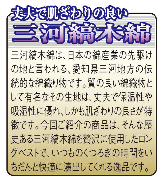 秋らしい空気を感じ始める頃に、とっても重宝するベストのご紹介です。おすすめのポイントは、お尻まですっぽり隠れるミセスに人気のロング丈。ゆったりとしたシルエットが、体型をさりげなくカバーしてくれます。重ね着しても余裕があり、多彩な着こなしが楽しめるのも魅力。身生地は肌ざわりの良さと丈夫な作りで知られる伝統の三河縞木綿で、落ち着いた風合いが上品な印象をアピールしてくれます。両脇スリット入りで足さばきが良く、歩行も軽快。前端とポケット口の縞柄がお洒落のポイントとして効いています。秋から春までの3シーズン楽しめて、ふだん着やお出かけ着はもちろん、旅先でのくつろぎにもおすすめ。確かな素材と仕立ての日本製ですので、自信をもっておすすめします。