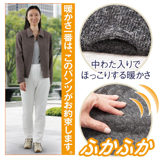 ジャケットやコートの素材に重宝され、特に冬の防寒素材として人気の高い "ふくれジャカード" を使用した、これまでにない発想のカジュアルパンツです。ウエストはゴム入りで締めつけ感がなく快適なはき心地。しかも左脇にコンシールファスナー付きで脱ぎ着がとてもらくです。立体感のある生地は、中綿が温まった体温を逃さず、かといってふくらみ過ぎず上品な仕上がり。ふれるだけでも暖かさが伝わり、ましてやはくパンツとなれば、これはもうどこにいてもぽかぽかとした温もりが実感できます。お部屋の中でも、屋外でも心地よい暖かさがいつまでも続きます。トップスとも合わせやすい3色組でお届けします。