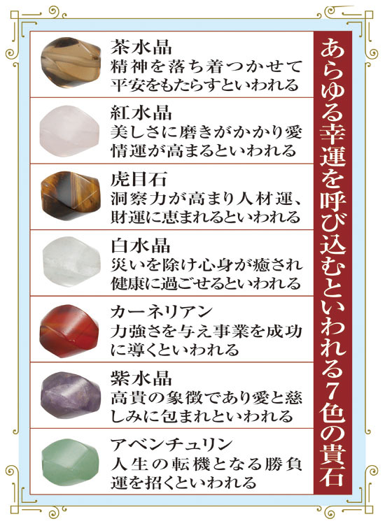 古来よりあらゆる幸運を呼び込むと言い伝えられてきた、7色の貴石を繋いだ開運祈願のネックレス。特に大粒で美しい、霊験あらたかなる天然石を厳選しました。財運・人材運をもたらすといわれる虎目石、高貴さを象徴する紫水晶、健康運を司る白水晶、愛情運を高めるという紅水晶、平安をもたらすという茶水晶、勝負運を好転させるという緑のアベンチュリン、事業運を拓くといわれるオレンジのカーネリアンと、色とりどりの貴石を贅沢に使用。さらに、ブラックトルマリンとシルバーパーツを加え、デザイン性も高めました。アジャスター付きで長さ調整もできます。災害が多発し不況が続く不安な時代だからこそ、身に着けていただきたい逸品です。