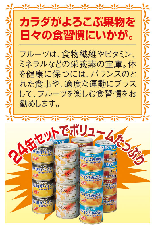 ●セット内容=フルーツミックス×6缶、フルーツみつまめ×6缶、パイン&みかん×4缶、厚切りパイン×4缶、杏仁フルーツ×4缶、合計24缶、内容量(約):各130g●原材料=もも、みかん、さくらんぼ、寒天、他●賞味期限=商品に明記●加工地=日本