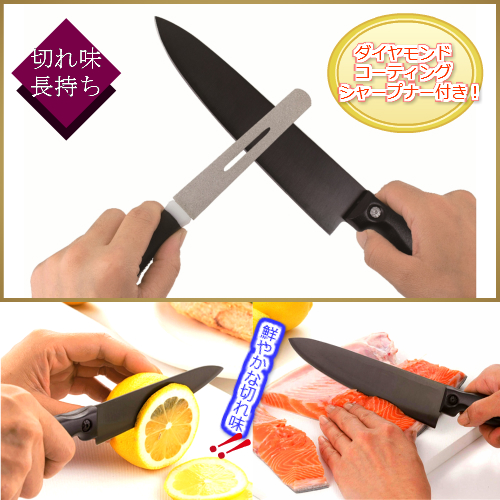 毎日使う包丁だからこそ良い物を使いたいもの。切れにくい包丁はイライラするばかりでなく、ついつい力を入れてしまうので危険です。そこでぜひお使いいただきたいのが、この「チタンコート包丁セット」です。刃の表面に軽くて丈夫なチタンを使用しているため、錆びにくく、食材のにおいや汚れがつきにくいのが特徴。もちろん切れ味の鋭さも抜群。切りにくい熟れたトマトもスパッと切れ、硬い骨付きの魚も力を使わずざっくり切断できる三徳包丁。薬味や細かい調理など、小回りの利く小三徳包丁。果物や野菜に重宝なペティナイフの3点セットで、お料理がグンと楽しくなります。食材や調理に合わせて使い分けできる大きさの違う3本に、切れ味がサッと甦るダイヤモンドシャープナーまでお付けして、お値打ち価格の1万円でご提供します。ぜひこの機会に、切れ味の違いをあなた様自身でご確認ください。
