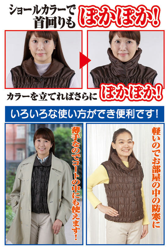 羽毛よりも蓄熱力があるといわれる、岩盤浴に使われる天然鉱石オーラストーンを練り込んだ「オーラ繊維」のインナーベストです。コレ1枚着込むだけで、体の芯からじわ~っと温めてくれる、まさに、着る岩盤浴! 冬場のミセスの悩みの種、冷えから貴女をしっかり守ります。わずか155gと驚きの軽さで、ぬくぬくなのにモコモコせず、ジャケットやコートの中に着込めば、外出ファッションがおしゃれに決まります。もちろん家の中でも大活躍。ショールカラーですので、スースーしやすい首周りまでぽかぽか。着ておやすみになれば、エアコン暖房を入れなくても暖かく寝られます。冬場はいつも冷えに悩まされるというミセスには、特におすすめの蓄熱性抜群のインナーベストです。