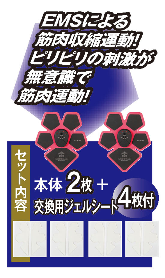 自宅で気軽に筋肉トレーニングをしたい…。でも激しい運動は年齢的にちょっと無理…。という方におすすめの「マッスルペンタゴン」です。使用方法は簡単で、腹回りや下腹、内股など、筋力の衰えが気になる部分にペタッと貼り付けてスイッチを入れるだけでOK。ピリピリとした心地よい電気の刺激が筋肉の収縮運動をサポートし、誰もが憧れるたくましい腹筋が目指せます。お腹やお尻に貼るだけなので、テレビを観ながらや家事をしながらでもOK。効果的な6種類のプログラムと10段階のパワーの切替で筋肉運動を助け、無意識のうちにラクしてトレーニングができるから便利です。本体は肌にピタッと貼り付くジェルシートなので、動いいても剥がれず安心。今回は、交換用ジェルシート4枚付きの計6枚組なので、ご夫婦やご家族、貼る部位で使い分ける際にも便利です。