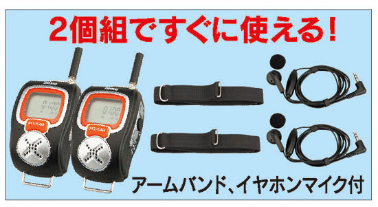 手に持って話していた携帯型トランシーバーが、なんと腕時計並のサイズに超小型・超軽量化されました! 付属のバンドで腕などに簡単に巻き付けられ、ボタンを押すだけの簡単操作で、イヤホンマイクを使って手ぶらで話せます。また、市販のネックストラップを使って首から下げたり、グリップで胸ポケットに挟んだり、装着箇所も自由自在。まったく邪魔になりません。農作業の進み具合を確認し合ったり、山歩きやハイキングに使用すれば、離ればなれになることもありません。町内の祭りなど、こまめな連絡が不可欠なイベントでは特に大活躍してくれます。2個組ですが、もちろん4個でも6個でも通信できますし、周波数を合わせれば他の機種との通信もできます。簡単便利で使い途も多い腕巻き式のトランシーバーを、この機会にどうぞお求めください。