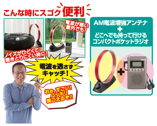 うるさいテレビ番組よりも、若い人向けのFM放送よりも、AMラジオがいちばん! というお年寄りが増えています。でも聴力も落ちてきて、感度の悪い場所だと聴きづらくてイライラが…そんな方にぜひおすすめなのが、このAM電波増強アンテナです。使い方は超簡単で、電源も接続も一切不要。聴いているラジオのそばに置くだけで、あら不思議! アナウンサーの声も歌手の歌声も、たちまちハッキリ聴こえてきます。室内でも野外でも、場所も時間も選ばずいつでも使え、一度使い出すと手放せなくなります。今回は特に、ポケットラジオとのセットでお届け。ワイドFM対応で、目覚まし時計代わりにもなるアラームなど便利な機能付きの最新機です。聴きづらさ解消のAM増強アンテナ、持ち運びに便利なポケットラジオで、好きなAM放送を思う存分お楽しみください。