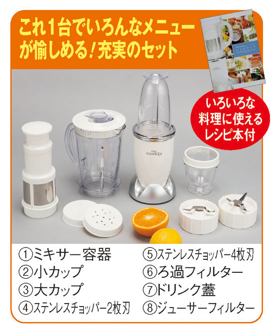 ジューサーやミキサー、ミルが欲しいけど、全部買い揃えようとすると置き場所や経済的にも大変…。そこでおすすめするのが、この1台3役の便利なチョッパーです。何と言っても魅力なのはその使いやすさ。カップに食材を入れてポンと本体をひと押しするだけで、野菜や果物のジュース、煮干しや昆布のだし用粉末、ハンバーグの野菜のみじん切りも、アッという間にできて重宝します。さらに、刻む・混ぜる・おろす・挽く・する・泡立てるの7通りの使い方もおまかせで、手間のかかる料理の下ごしらえも素早くできて助かります。カップやチョッパーなどの取り付け取り外しも簡単でお手入れラクラク。本品を使ったレシピ本付きで、美味しくてヘルシーな料理や健康ジュース、意外な活用法なども紹介しています。ぜひ、お求めいただき、毎日の食生活にお役立てください。