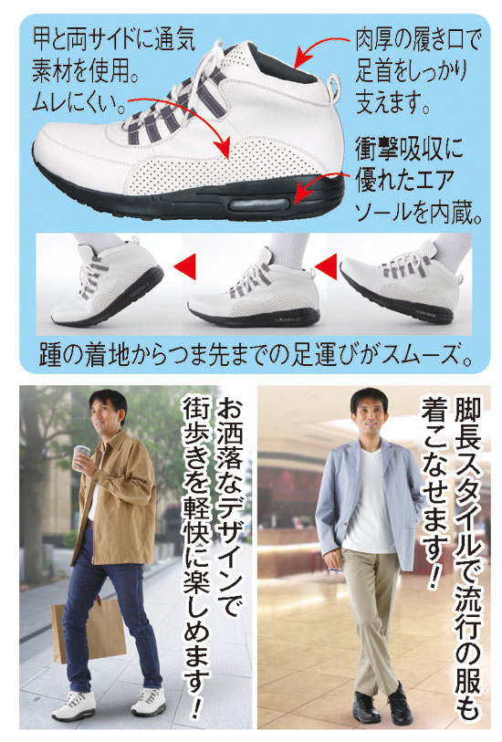 もっと脚を長く見せたい…。流行の服をお洒落に着こなしたい…。そんなお望みをかなえてくれる脚長カジュアルシューズのご紹介です。履くだけで身長が高くなる魔法のようなシューズで、なんと6cmもアップ。スラリと伸びた脚長スタイルがいとも簡単に完成し、今人気のコーディネートも自信をもって楽しめます。履き心地にも徹底してこだわり、甲と両サイドには通気性に優れた素材を使用しているのでムレにくく快適。エアソール内蔵でクッション性にも優れ、足腰にかかる衝撃を吸収するので歩行は軽快です。しかも、足運びがスムーズで、お買い物やタウンでもラクラク。さらに、中敷きは抗菌・防臭加工が施され、臭いを防ぐから出先で脱いだときも安心です。肉厚の履き口が足首をしっかり支え安定感抜群。ぜひ貴方もお試しになり、憧れの脚長スタイルをご満喫ください。
