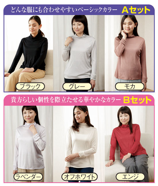 上質なシルクをたっぷり使った贅沢な長袖シャツのご紹介です。シルク100%の身生地はニット素材で伸縮性があり、動きやすくて快適な着心地。軽くて肌ざわりがしっとりとして優しく、美しい光沢感は見ているだけでうっとりします。また、シルクは通気性と吸汗性、保温性にも優れ、ムレにくくて暖かく寒い季節にはうってつけ。衿元のハイネックは上品な印象をぐんと引き立て、日焼けや首まわりが気になるという方にもおすすめです。ゆったりとしたデザインなので心地よく、コートやジャケットなどと合わせやすいのも魅力。色は、ブラックとグレーとモカ、又はエンジとラベンダーとオフホワイトの各3色組から選べます。お値段ぐんと控えめですので、今がお求めになる絶好のチャンスです。