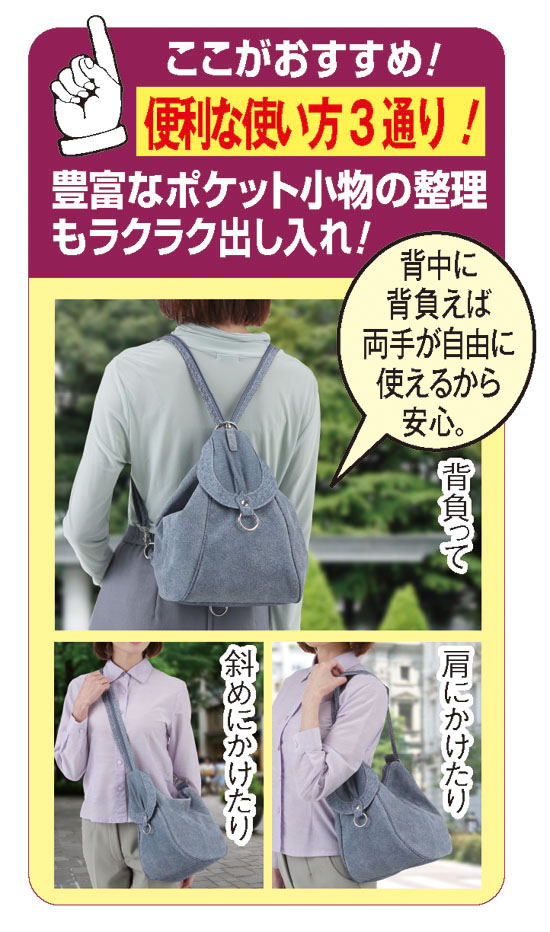 一見、デニム生地のようですが、実は本革にデニム調プリントを施した、おしゃれで機能的な3WAYバッグです。コンパクトでかわいいデザインはもちろん、使い勝手も秀逸。ショルダーベルトのファスナーを開閉することで、リュックでも、ショルダーでも使えます! さらに、ショルダーベルトを長くすると斜め掛けにも対応します。素材に使用したのは摩擦に強くて丈夫なピッグスキン(豚革)で、傷みにくいので末永く使えます。しかも軽量で肩に負担がかかりにくく、荷物が多めでも疲れません。コンパクトでも収納性にも優れ、豊富な収納ポケットは仕分けにも便利。背面ファスナー付きで、携帯電話などの出し入れでまごつくこともありません。デニム生地のような親しみやすい色使いと上品なデザインは、ふだん使いはもちろん、街歩きやお買い物、旅行などにもおすすめです。