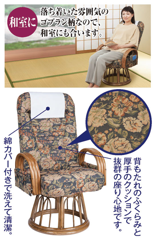 自然でやさしい風合いが人気の籐素材を贅沢に使用した、高級感あふれる回転座椅子のご紹介です。まず目を引くのは、和室や洋室にも良く合う落ち着いた雰囲気にあふれたゴブラン柄。背もたれとクッションはふかふかとして心地良く、一度座ったらもう動けません。背もたれは3段階のリクライニング式で、テレビの視聴や読書、ケータイの操作もラクラク。座椅子はクルリと360度回転するので、周りの物を取る際やテレビに向きを合せる際にも重宝します。さらに、座面を程よい高さにし、しかも肘掛け付きなので、ご年配の方でも立ち座りがとてもラク。両サイドにはリモコンや新聞の収納に便利なポケット付きでサッと取り出せて便利です。背もたれは洗える綿のヘッドカバー付きで汚れるのを防止。籐は丈夫で末永くお使いいただけますので、自信をもっておすすめいたします。