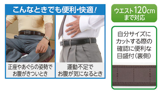 近頃、お腹ポッコリでベルトが合わない…。ベルトの穴に留めるのが面倒…。そんなお悩みをスッキリ解消する今話題のベルトのご紹介です。人気の秘密は、ご年配の方でもラクラクのサイズ調節。なんと6mm間隔で38段階の調節ができるので、食後にお腹がポッコリしてもサイズ調節が簡単です。しかも、穴に留めるわずらわしさがなく、着脱が大変スムーズ。バックルの後が残らず、いつまでも新品みたいに綺麗です。ウエストは110cmまで対応し、どんなサイズにも余裕でフィット。色はシンプルな黒と茶、バックルは高級感のあるツヤ消し仕上げなので、フォーマルからカジュアルまで幅広く使えます。ベルトの裏は2.5cm間隔の目盛り付きなのでカットも簡単。4本セットでお買い求めいただくと、2本セットとくらべて3,000円もお得ですので、ぜひ4本セットをおすすめします。