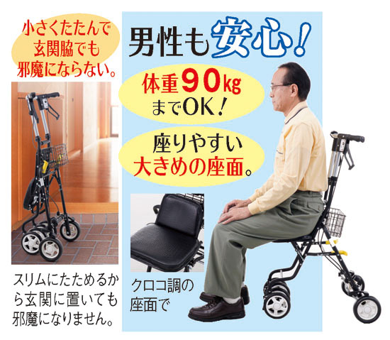 シルバーカーはハンドルが低くて、背の高い女性や男性には使いにくい…。そんなお悩みをスッキリ解消した、今注目のシルバーカーです。一般的なシルバーカーのハンドルの高さは80cm台ですが、本品はなんと最大98cmまで調節可能! 背の高い男性でも、足腰に負担をかけず快適に使えます。さらに、湾曲したハンドルは車体に身体を預けやすく、安定感がぐんとアップ。軽い力でできる操作性にもこだわり、前輪ロックや駐車ロックはレバーを上げ下げするだけで簡単です。LEDライトは点灯・点滅が切り替えられ夜間も安心。イスは座面が大きめで男性でもラクに座れ、カゴはお買物に便利です。車輪は丈夫で摩耗に強く、後輪は太めで安定感抜群。コンパクトに折りたためられ収納にも便利で、持ち運びも簡単です。黒が基調にした高級感のあるデザインも魅力の一台です。
