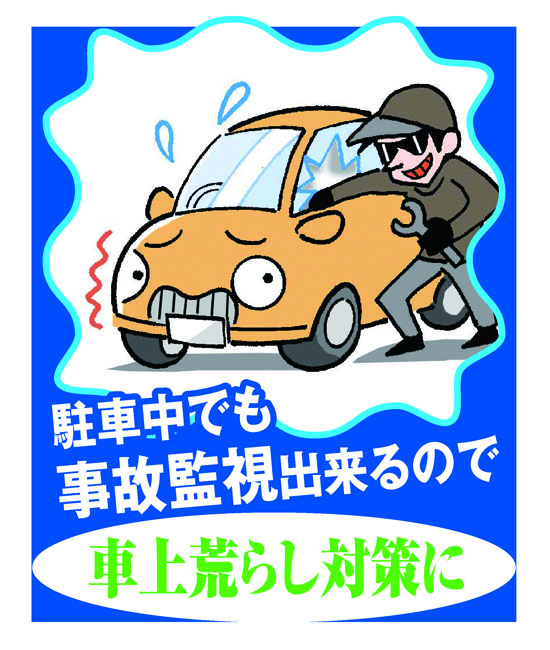 今、社会問題になっているあおり運転。車上荒らし、駐車中の衝突事故…。運転中も、車を停めても安心できません。そこで注目されているのがドライブレコーダー。従来のカメラでは録画できなかった車内をはじめ、バックカメラを装備することで後方までもカバー。用途に合わせてワイド、全球、前後、4分割とモードを変更できます。これであらゆる事故・事件・迷惑行為の対策がより完璧に。バックカメラは駐車時にも役立ちます。取り付けは簡単、電源はシガーソケットから取り、電源を入れるだけで録画を開始。衝撃を感知すると自動で録画がスタートするので、駐車中の車上荒らしにも安心です。また、あおり運転を抑止する「録画中ステッカー」もお付けします。