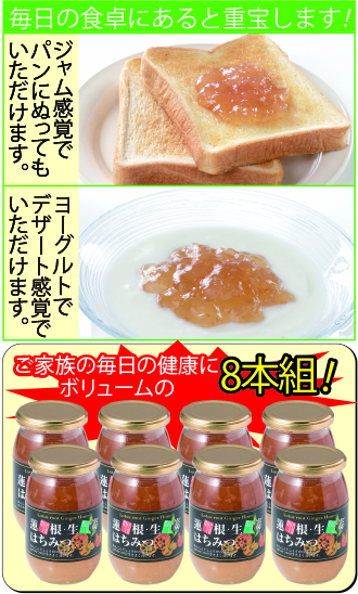 季節の変わり目は身体が冷えたり風邪をひいたり体調を崩しがち。何かいい食べ物はないかしら…。という方にぜひおすすめの「蓮根生姜はちみつ」のご紹介です。ビタミンCが豊富で風邪を引いた時の喉に良いといわれる蓮根と、辛味成分のジンゲロールやショウガオールが豊富で身体を温めてくれる生姜、そしてビタミンやミネラルなどが充実して疲労回復によいとされる蜂蜜を一つにした一品で、健康の維持と増進に大活躍。ジャムのようにパンにぬったり、お湯に溶かしても美味しくいただけて、日々の健康習慣に重宝します。名産地と安心・安全にこだわった素材使いも魅力で、生姜は高知県産、蓮根は山口県産を使用。蓮根、生姜、蜂蜜の栄養が一度に摂れてクセもないので料理の隠し味としてもおすすめです。今回は8本組でご提供いたしますので、ご夫婦やご家族の健康なカラダづくりに、ぜひお役立てください。