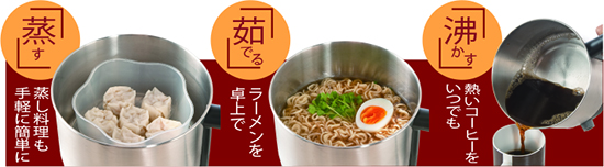 火を一切使わずに、沸かす、煮る、蒸す、茹でるの4役が、これ1台で出来る便利で安全な調理鍋です。熱源は電気なので、火の取り扱いが苦手になったご年配の方でも安心。インスタントラーメンや味噌汁をはじめ、煮物も安全に簡単に作れて重宝します。また、台所はもちろん、テーブルの上でも調理ができて、鍋物などを召し上がる際にも便利。さらに、保温機能付きで料理はいつでも温かく、鍋物や味噌汁が煮詰まる心配も不要です。電気ポットとしても使え、卓上で熱いコーヒーやお茶を飲みたい時にも活躍し、付属の蒸し網や蒸しトレイを使えば温野菜や温泉卵も作れます。しかも取っ手付きで持ちやすく、ガラス蓋は料理が見えて便利。こんなに使い勝手に優れてた鍋を2台!多彩な料理をお楽しみください。