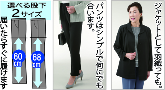 いつ必要になるかわからないフォーマルの備えは万全ですか。前に買ったものを出してみたらサイズが合わなかったり、デザインが古臭くて着るのが恥ずかしかったり…。そんな不安を解消してくれるフォーマルウェアをご紹介いたします。上着は定番の3つボタンのショールカラーに肩パット入りというシンプルなデザイン。流行に左右されずいつまでも長く着ていただけます。また胸元にタックを入れることでふんわりしたシルエットですから、女性らしいシルエットを作り出し、体型が変わってふっくらしてきてもしっかりカバーできて安心です。また気になるお尻のラインをすっぽり隠すことができ、スッキリとした体型に。パンツはウエスト総ゴムで脱ぎ着が簡単で、お腹周りがラクラクです。ふんわりと軽い着心地も魅力で、長時間着ていても着疲れの心配もありません。サイズがSから3Lと豊富に揃い、パンツの股下を2種類から選べますので、あなたにぴったりの一着をお選びいただけ、届いてすぐに着ていただけます。