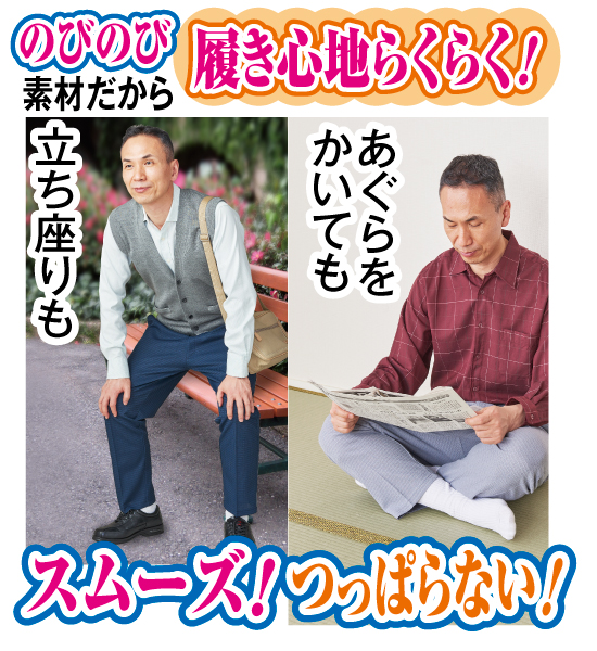 ジャージはラクでいいけど、だらしなく見えて困る…。そんな紳士にうってつけのパンツです。伸縮性のあるニット素材で、膝の曲げ伸ばしはもちろん、どんな姿勢や動きもラクにできるから快適そのもの。でも、見た目はきちんとした印象で、お出かけにも堂々とはいていただけます。ウエストは総ゴム仕様で脱ぎはきがラクにでき、ベルトループ付きなのでジャケットスタイルにも合わせていただけます。前ファスナー式でトイレも安心。2つのポケットに小物を入れて身軽に外出できます。サイズはMから3Lまで揃え、股下丈も選べるので面倒な裾上げの必要がなく、届いたらすぐにはいていただけます。ネイビーとグレーを各2本ずつの計4本組でお届けしますので、はき回しが効き、洗い替えにも困らずたいへん重宝です。