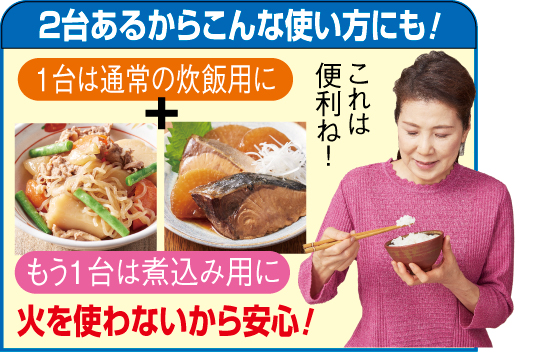 昔懐かしい土鍋で炊いたご飯が美味しいのはわかっていても、火加減が面倒だったり、後片付けが大変だったり…。そこで土釜炊飯器がおすすめです。しかも今回は最大3合まで炊ける炊飯器を2台セットにして、なんと19,800円と目を疑うような驚きの価格ですから、これは絶対に見逃せません。大火力で一気にムラなく熱を伝え、高温をキープする3層構造土釜を採用。さらに立体構造による加熱制御で適温を調節し、まるで土鍋で炊いたようにふっくらツヤツヤと炊き上がり、お米本来のおいしさを引き出します。大火力なのに省エネ設計ですから電気代もしっかり節約。ボタン類は前面に集められていて、操作しやすくお年寄でも簡単にお使いいただけます。2台セットでこの価格なら、一台をご家族やお友達に譲っても喜ばれること請け合いです。ぜひこ機会に、お買い求めください。