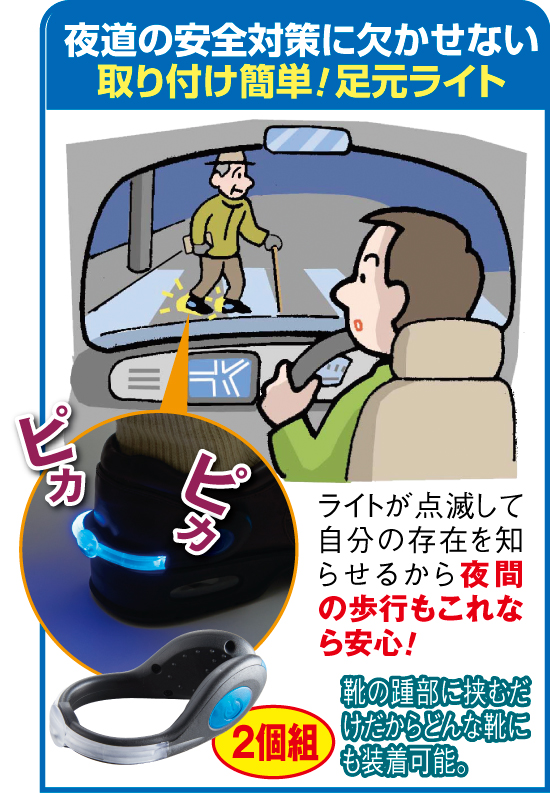 いつまでも自分の足で歩きたい方の強い味方になる杖。でも、ぐらついて安定感のないもの、歩きにくいものでは意味がありません。そこでご紹介するのがこの杖です。スキーのストックのように両手で使うタイプでとにかく歩きやすく、自然と背筋が伸びて猫背になりにくくどんどん歩けるようになります。しかも地面を3点で支えることで安定感も抜群です。アルミ製の軽量タイプなので疲れにくく、丈夫で力がかかっても変形しにくく永くご愛用いただけるのも魅力。身長に合わせて10段階に長さ調節ができ、あなたにぴったりのサイズでお使いいただけます。この杖と一緒なら、いつもより長く歩け、毎日のお出かけがグ~ンと楽しみに。さらに靴に付けて点滅するライトもセットしましたので、早朝や夕暮れ時の車から人が見えにくい時間帯のお出かけも安心です。