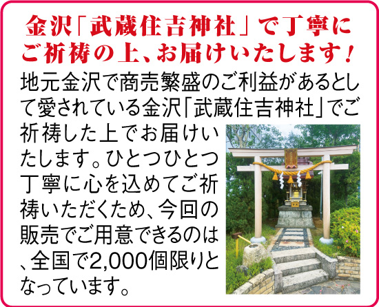 古来より輝きにより魔を退け、福をもたらすと言われている「金箔」を贅沢に使用したブレスレットを紹介します。古来より金は、東西南北いずれの方向からも福を招く招福厄除の言い伝えがあります。今回は、約400年の歴史をもつ「金沢金箔」を2石の宝珠に封じ、金運財運の上昇を祈願できるブレスレットに仕上げました。その上品な輝きは金沢金箔の伝統を受け継ぐ「匠の技」によって生み出される本物の証です。しかも商売繁盛の御利益があるとして知られる金沢「武蔵住吉神社」でひとつひとつ丁寧にご祈祷した上でお届けいたしますので、今回は、全国で2,000個のみとなる希少な逸品。さらに金運財運の象徴「金龍」を彫り込んだ貴石も配置しました。運気上昇を祈願できるブレスレットを身につけて、日々の金運財運上昇、開運をご祈願なさってください。