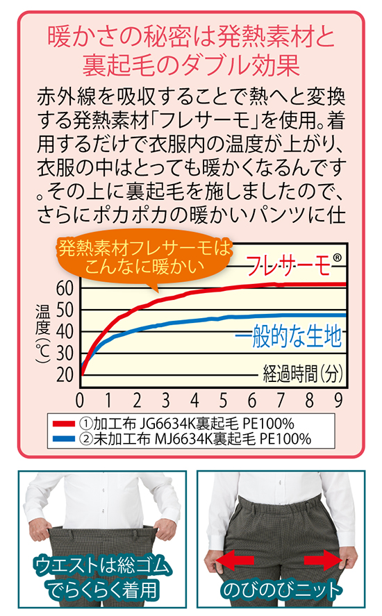 寒い冬にはあったかい素材のパンツを履きたいものです。そんな方におすすめしたい紳士用パンツの紹介です。このパンツがとても暖かい秘密は、発熱素材フレサーモと裏起毛のダブル効果。フレサーモは赤外線を吸収して熱へと変換、衣服内の温度を上げるのでとても暖か。さらに裏起毛を施すことで保温効果もう高まるので、さらに暖かいんです。だから寒い冬の屋外でもいつもポッカポカ。またウエストがゴム仕様のため窮屈さを感じず、のびのび素材で着心地もよく、ウエスト部分にはベルトループが付いているため、お出かけやお仕事にも重宝します。洗濯機で丸洗いでき、お手入れ簡単なところもおすすめ。2色4本セットで、冬の乾きにくい時期に洗い替えがあることはとても助かります。また裾直しなく直ぐに履いていただけるよう3丈からお選びいただけます。