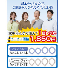 暑い夏の外出や屋外での作業、ジョギングやアウトドアに、と外に出ている間の暑さ・熱射病の対策に、首すじからダイレクトに冷たさが伝わるヒンヤリ冷輪リングの8本セットです。過去に首かけ式の扇風機だったり接触冷感マフラー等、ほてった体を冷やす小物はいくつもありましたが、この商品にまさるものはないかも?使い方もカンタン、冷たい水や冷蔵庫で冷やせばすぐ使え、冷たさが消えればもう一度。何度も繰り返しOK!8本セットでサイズもMとLを用意。首回りに合わせて選べます。この夏、ご家族でヒンヤリ気持ちよく。