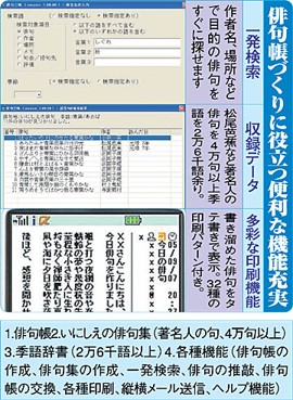 俳句三昧は、従来紙と鉛筆で整理した俳句をパソコン上で整理するソフトウェアです。簡単で確実な記録、多彩な検索やさまざまな形式での印刷ができ、パソコンで簡単に俳句帳を作成していただけます。語句や日付、場所などで探せる高度な検索機能。俳句づくりの手本になる著名俳人、正岡子規、松尾芭蕉、小林一茶、与謝野蕪村、河東碧梧桐などの俳句を4万句以上収録。さらに季語を2万6千以上収録していますので俳句を詠むのに参考にしていただけます。また、書き溜めた俳句は縦書きに表示し、印刷したり、お気に入りの俳句に写真の画像を入れて美しいオリジナル俳句集を簡単に作ることができます。同じソフトをお持ちの友人同士で、俳句帳の交換も楽しめます。