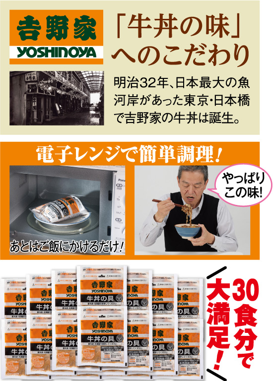 子どもから大人まで、幅広い人気を誇る吉野家の牛丼。東京日本橋で明治32年に創業以来120年以上の歴史を持つ吉野家秘伝の味をご家庭で簡単に味わえます。お店と同じ材料で同じ味を再現。まろやかで香り豊かな秘伝のタレ。熟成した甘味のあるしょうがのすりおろしを加えた、深みのある味は他の牛丼屋さんでは味わえないおいしさです。しかも調理方法は電子レンジで温めるだけ!ご飯にのせればご家庭でアツアツの牛丼が召し上がれます。牛丼を味わうのはもちろん、肉豆腐や肉吸い、肉うどん、あいがけカレーなどアレンジ料理も楽しめます。今回は、ご家族全員でたっぷり楽しめる30食セットでお届け。この機会にぜひ吉野家の牛丼の味をご家庭でご堪能ください。※お支払いは振替用紙またはクレジットになります。