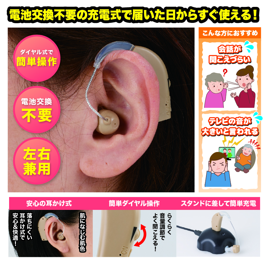 「最近会話が聞き取れない…」「テレビの音量が大きいと言われる…」とお悩みの方へ、耳かけ式集音器はいかがでしょうか。左右どちらの耳にもお使いいただけ、ダイヤルを回すだけで簡単に音量調節ができ、小さな声や音もよく聞こえます!面倒な電池交換は不要で、付属のスタンドに差し込めば充電が可能。フル充電すれば約1日中使えて外出時にも心強いです。