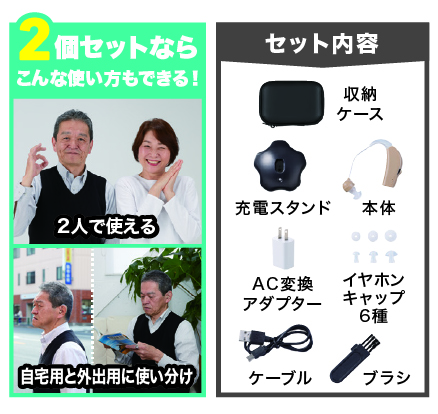 ●セット内容(1個)=充電スタンド、USB充電ケーブル1本、イヤホンキャップ6種、お掃除ブラシ、収納ケース、取扱説明書(CN)、アダプター セット内容は全て各2●サイズ=4.3×1cm 8g●素材=ABS樹脂 他●中国製 ※補聴器ではありません。