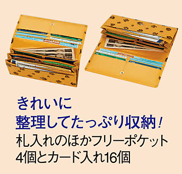 絵文字作家の藍浩之氏が七福神にちなんで、円萬ほほえみ書体と名づけた書体で、恵・愛・開・喜・豊・福・寿の七つの縁起の良い文字を全面にちりばめた七福字円萬財布です。使い続けていくことで七つの願いが成就し、円萬になって、たくさんのお金が集まってきますようにと願って作られました。円萬ほほえみ書体は字から湧いてくるイメージを絵にした独創的な文字で、これまでもお誕生記念、結婚祝い等で創作文字として喜ばれています。色は黄金色のシャンパンゴールド、風水ではラッキーカラーのイエロー、格調高いブラウンの3色をご用意しました。牛革製の使い勝手のよい財布で、カードやお札、小銭もたっぷり収納できます。
