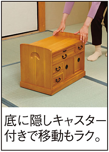 お茶の道具や薬、眼鏡、リモコンなど、つい散らかりがちなお部屋。そんな小物類をまとめて収納でき、しかもジャマになりにくいコンパクトサイズの小袖机をご紹介します。天板部分はちょっとした書き物をしたり、お茶をいれたりできてたいへん重宝。またスライドテーブルもあり、サッと引き出して物を一時的に置くこともできます。引き戸式の収納部は高さがあるので、茶葉の入った缶や瓶類などを立てたままで入れられて便利。引き出しが計4箇所あるので小物を整理して入れられ、必要な時にすぐ出して使うことができます。キャスター式ですから軽い力で移動でき、左右に取っ手が付いていて簡単に持ち上げられるので、お掃除の時もラク。木目調の落ち着いた表情は和室にぴったりで、リビングのソファー脇に置くサイドテーブルとしても活躍します。