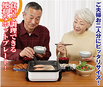 食卓で調理できるホットプレートは便利。でも大きすぎてテーブルでジャマになったり、収納に困ったり…。そこで手軽に使えるコンパクトな卓上グリルをご紹介します。ちょうどご夫婦お二人分にピッタリのサイズで、テーブルを占領することもなく、ご飯やお惣菜や飲み物などを一緒に置いてもジャマになりません。しかもプレート面に穴があいていて余分な脂を落とすので、とってもヘルシーに仕上がります。また卓上で素早く調理できますから焼き上りをあたたかいまま食べられて、外側にこんがり美味しい焼き色をつけるのも思いのままです。マーブルコート加工を施していますからこびりつきにくく、外して丸洗いできるのでお手入れも簡単。収納もかさばらす、必要な時にサッと出して、軽々と運べて大変重宝ですので、この機会にぜひ常備品としてお買い求めください。