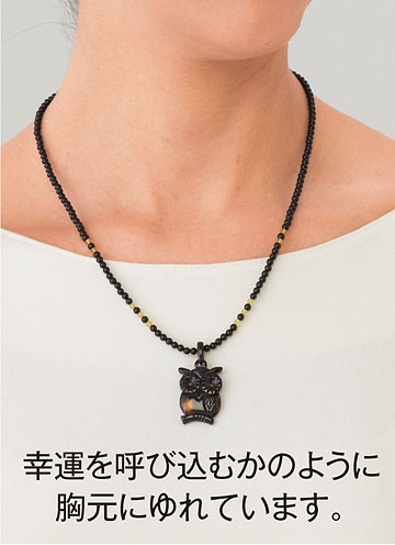 福がこもる「福籠」、苦労をなくす「不苦労」など、古来より縁起のよい鳥として崇められてきた「ふくろう」の飾りをトップにした、おしゃれでかわいいペンダントです。飾りの「ふくろう」は、長寿の象徴であるカメの甲羅のべっ甲を使い、丹念に彫り上げました。幸せへの祈願を込めた、大変おめでたい逸品です。ネックレスは、上品な漆黒のオニキスを主珠とし、アクセントとして琥珀をあしらいました。コントラストの利いた配色で、着ける方の胸元を美しく彩ります。全体に落ち着いた色調で、お手持ちのファッションとも合わせやすい重宝なペンダントです。