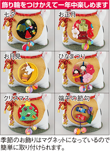 織物の聖地、京都の西陣に本拠を構える、和物雑貨の専門メーカー「リュウコドウ」が、伝統素材のちりめんで作った、招き猫のお人形です。金運を招くといわれる、鈴を持った右手を上げたポーズで、福々しい笑顔は愛嬌たっぷり!眺めるだけで心和む逸品です。かわいいお腹のお飾りも見逃せません。お正月・ひなまつり・端午の節句・七夕・お月見・クリスマスと、季節ごとに磁石で簡単に取り付け・取り替えでき、飽きが来ません。それぞれの季節感を情緒豊かに伝えながら、一年を通してお部屋を明るく彩ります。季節ごとに取り替えられるお飾りは、単品で飾っていただくこともできます。縁起のよい招き猫と季節感を楽しむお飾りによる、癒しのインテリア。玄関や床の間、リビングのサイドボードの上など、お好きな場所にお飾りください。