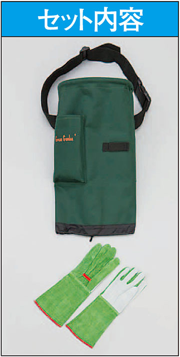 入れやすく出しやすいガーデニングバッグと手のひら部分が革仕上げでバラのトゲなども刺さらず怪我防止にもなるグローブのセットです。バッグの入り口は樹脂リングが内蔵して常に開いた状態なので収穫物もラクに入ります。また、底はコードロック式の開閉自在になっており、コードロックを緩めると花や収穫物を傷めることもなく簡単に取り出せます。バッグはショルダー、ウエストのどちらにも使え、常に身体に密着しているだけでなく、両手が使えるので効率よく作業できます。また、グローブは腕までカバーするロングタイプで、通気性がよく柔らか仕上げで手にフィットして枝間に手を伸ばしても安全に作業できます。果物や野菜の収穫、花や庭木の手入れや山菜採りなどに便利にお使いいただけます。