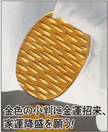 座って片方の前足を挙げて人を手招きするような姿の猫の像は、古くからお客様や財宝を招くといわれてきました。その招き猫に金色の小判を持たせた縁起のよい水晶の置物です。作者は甲州水晶貴石細工の第一人者、伝統工芸士として山梨の名工とされる米長朝喜氏。水晶の原石を生かした彫刻で動物の置物、工芸的作品、アクセサリーなど幅広く作成する中で、この招き猫は縁起置物の代表的な作品です。瑞宝単光章受章の氏が一点一点丹念に彫り上げ、磨き上げた水晶貴石細工の逸品。その微笑ましい表情の招き猫に金色の小判を持たせた縁起のよい姿は、お好きな場所に飾るだけで、ザクザクと金運、幸運を呼び込んでくれそう。